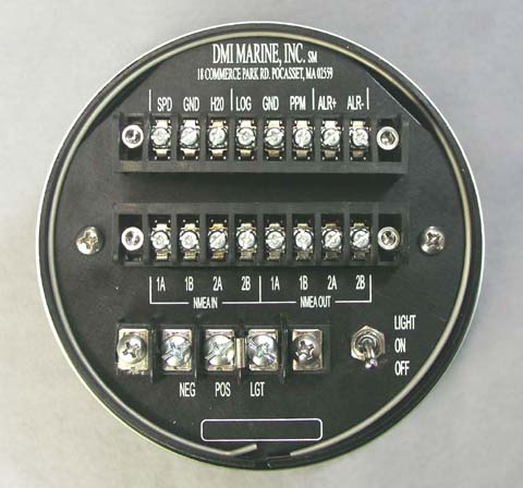 Rear panel contains all connections. SPD GRD H2O : used to connect speed/temp sensor for use as a main unit LOG GRD PPM : LOG output is +12 vdc pulsed every .1 NM The PPM is Pulse per NM set at 200. Selection can be made through menu for 100 or 400 as well. ALR+ / ALR- : +12vdc output for external alarm. NMEA IN : Two NMEA 0183 input connections. 1A(+) 1B(-) & 2A(+) & 2B(-) Both inputs are combined and exit NMEA OUT port 2. Both data inputs can be viewed in menu under NMEA Reader function. NMEA OUT : Two NMEA 0183 outputs connections. Port 1 contains only PHS NMEA data. Port 2 contains port 1 & port 2 inputs as well as PHS outputs. NEG POS LGT : Power and night light inputs. Input voltage is 12vdc. Use jumper across POS & LGT for night light operation, or remove jumper and use external light control for night light intensity adjustment.